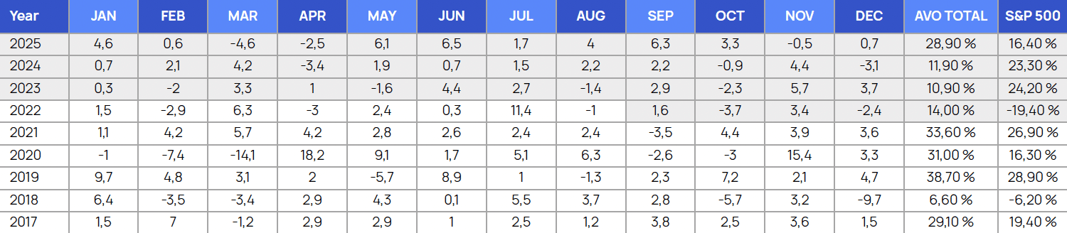 Progressive pilot years, achieving 10–28.9% returns with low volatility